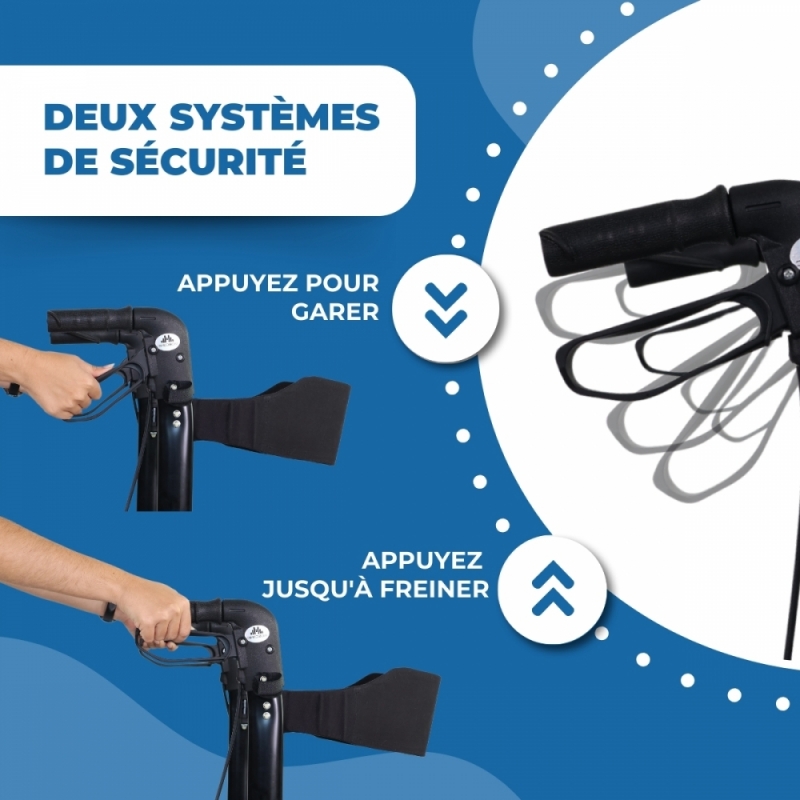 Ce déambulateur pour personnes âgées comprend des poignées ergonomiques confortables qui aident à réduire la fatigue lors de l'utilisation. Dans sa poignée, il comprend des freins à activation douce pour arrêter le déambulateur juste au moment souhaité et sans effort.