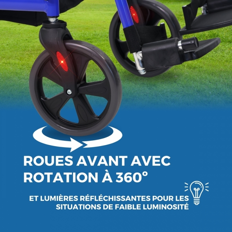 Avec les 4 roues pleines de ce déambulateur avec siège, inutile de craindre des crevaisons intempestives, car elles sont conçues pour franchir confortablement les petits obstacles en surface, aussi bien à l'intérieur qu'à l'extérieur.