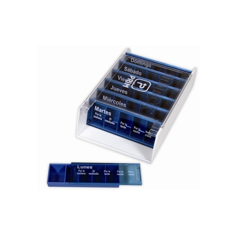 Description : Contient sept compartiments, un pour chaque jour de la semaine. Chaque compartiment est divisé en cinq espaces pour les différentes prises : matin, midi, soir, nuit et un cinquième espace en cas de besoin spécifique. Les sept compartiments journaliers sont incorporés dans une base facile à retirer afin d’emporter les médicaments de la journée avec soi. Le couvercle est doté d’une protection solaire qui protège les médicaments du rayonnement UV.