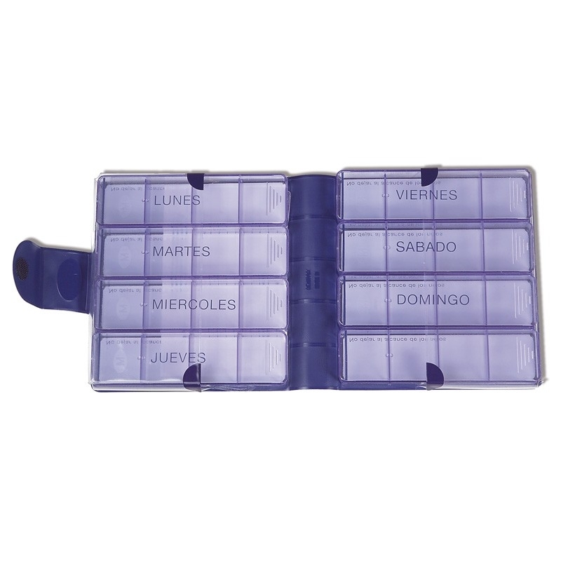 Par conséquent, il est spécial pour les patients avec des doses très élevées de médicaments, avec des problèmes de mobilité ou de vision. En tout, il y a huit compartiments à 4 cubes, un pour chaque jour de la semaine et un de rechange. Il inclut un étui en plastique avec fermeture velcro.