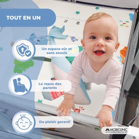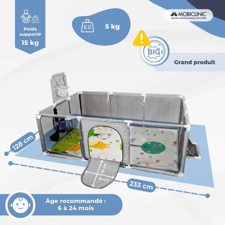 Grâce à ses dimensions de 128 x 233 cm, il offre un espace de jeu spacieux et confortable où les petits peuvent ramper, se tenir debout, jouer ou faire leurs premiers pas en toute sécurité. Le tapis inclus offre également une surface rembourrée qui isole le sol et favorise le jeu ou le repos.