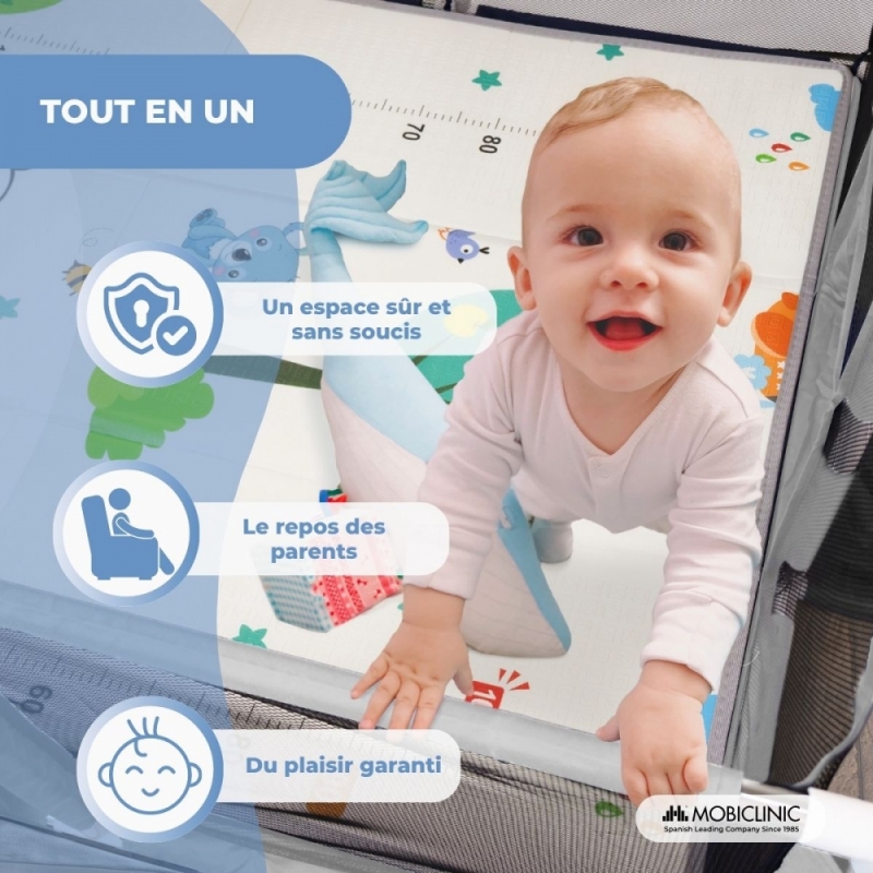 Pour encourager l'autonomie et la coordination des tout-petits, le parc est équipé de quatre anneaux de sécurité conçus pour les aider à apprendre à se tenir debout progressivement et en toute sécurité. Ses parois en filet respirant permettent aux parents de surveiller leur bébé à tout moment et assurent une ventilation constante.
