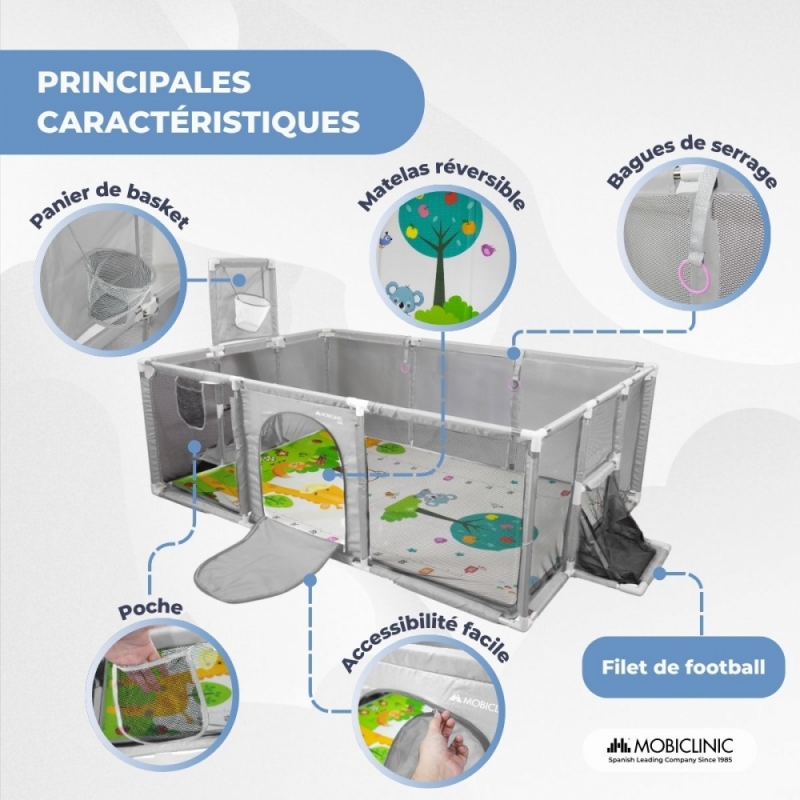 L'aire de jeux Kidland est un espace alliant jeu, développement et divertissement pour les tout-petits. Son design multifonctionnel, avec son panier de basket et son filet de football intégrés, encourage l'activité physique dès l'âge de 6 mois.