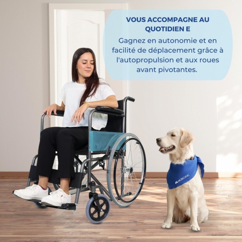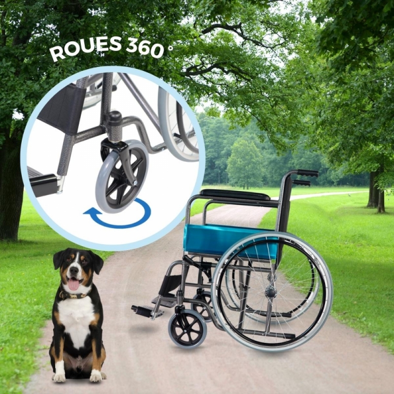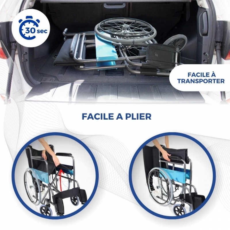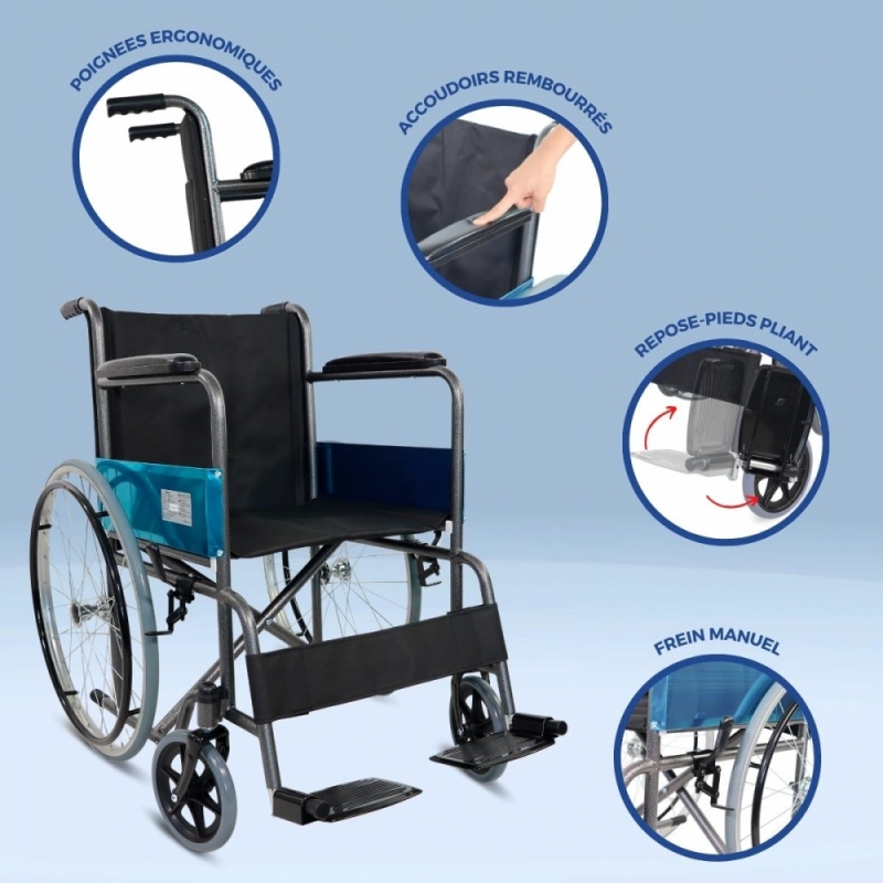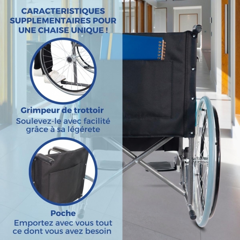 Son assise et son dossier sont ergonomiques, conçus pour offrir le plus grand confort possible. Le dossier comprend une poche de sécurité pour ranger vos affaires. Les roues sont spécialement conçues pour garantir la sécurité et faciliter la mobilité, nécessitant un minimum d'effort. C'est un fauteuil roulant économique , qui a une grande autonomie avec des roues qui minimisent l'effort et des freins manuels qui empêchent un éventuel basculement. Les freins manuels garantissent la sécurité, car ils empêchent le démarrage et le renversement du fauteuil pour les personnes handicapées dans des conditions défavorables.