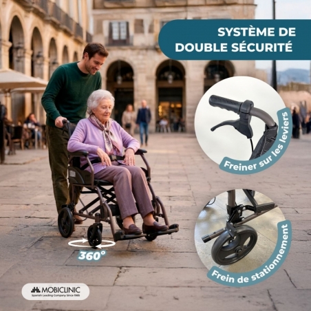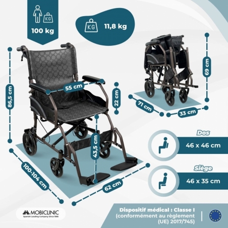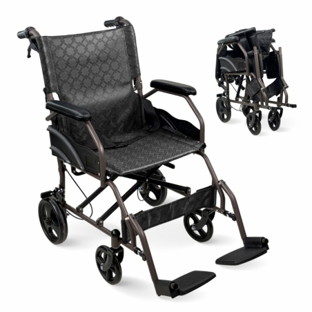 Ce fauteuil est doté d'un dossier inclinable et de repose-pieds escamotables. Son système de pliage permet un encombrement réduit, facilitant ainsi son transport en voiture et son rangement à domicile. Idéal pour les personnes disposant d'un espace limité ou l'emportant fréquemment en voyage.