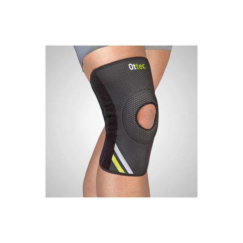 FORME ANATOMIQUE : Élasticité uniforme dans toutes les directions : meilleure adaptation, ajustement et placement. Ne limite pas la mobilité. Logement pour la rotule, évitant la pression sur celle-ci et facilitant la flexo-extension. Varillas spirales latérales en acier. Turbine en matériau viscoélastique.