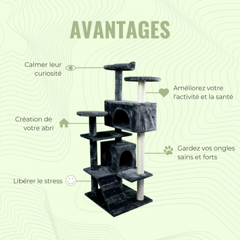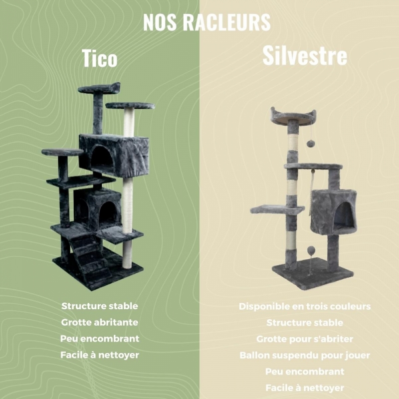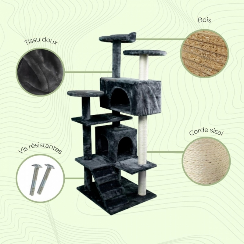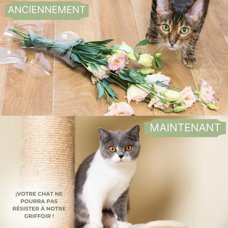 Les arbres à chats sont conçus pour apprendre à votre chat à respecter le rembourrage des chaises, canapés et autres meubles de la maison. La clé pour satisfaire le besoin naturel d'un chat d'aiguiser ses griffes est ce griffoir pour chats. Cet accessoire permet au chat de développer son instinct naturel, tout en protégeant vos meubles. Les arbres à chats sont très polyvalents, car ils offrent également de multiples possibilités de jeu et de repos.