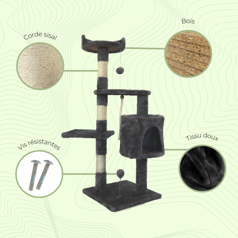 - Deux colonnes surélevées : les colonnes viennent parfaire le design et ajoutent une corde sisal à la structure pour que votre chat puisse jouer et déstresser.