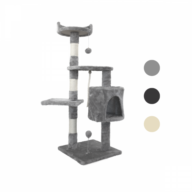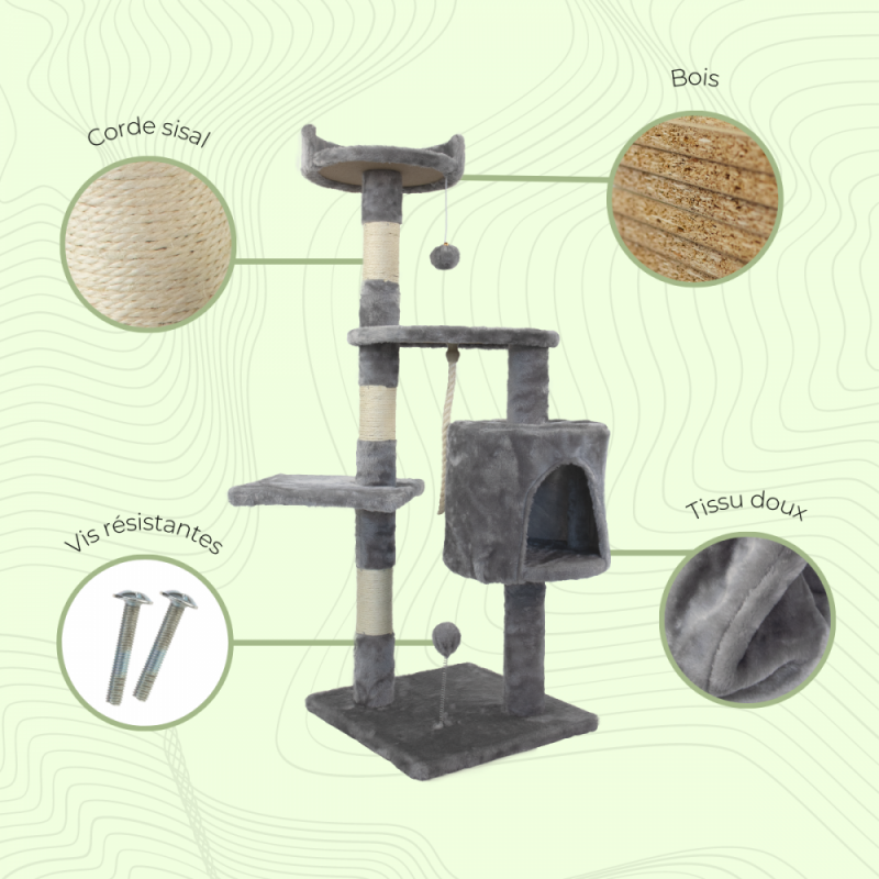 - Griffoir avec maison pour dormir et jouer : Un abri avec une entrée ronde reliée par une colonne pour que votre chat puisse profiter à la fois du jeu et de la détente.