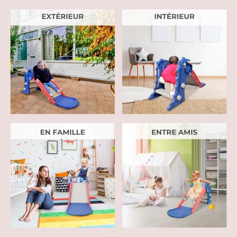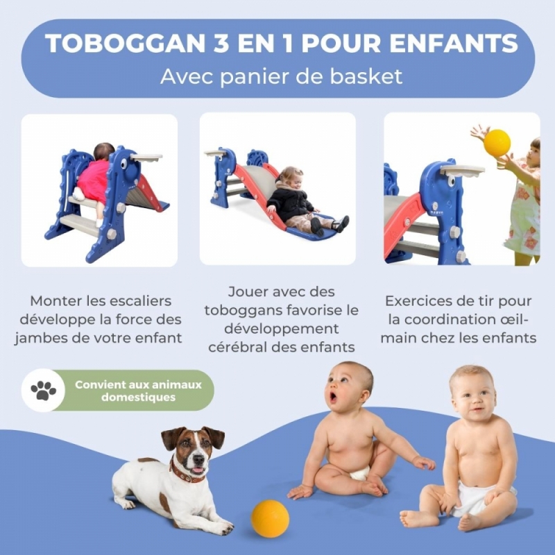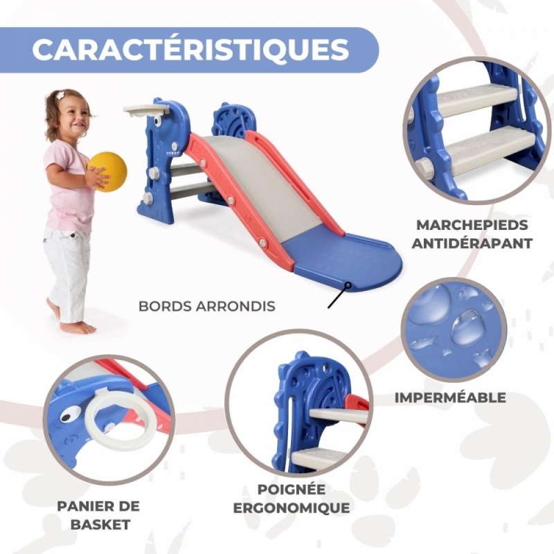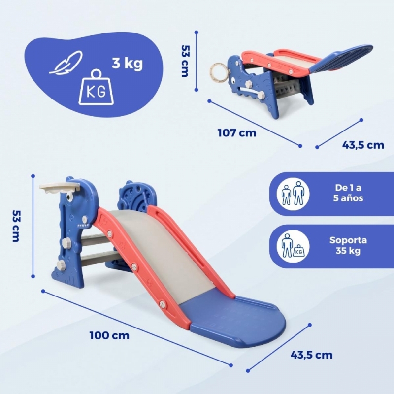 Toboggan pour enfants | Pliable | Panier | Ballon | Bords arrondis | Marches antidérapantes | Max.35kg | Bleu | Dino| Mobiclinic