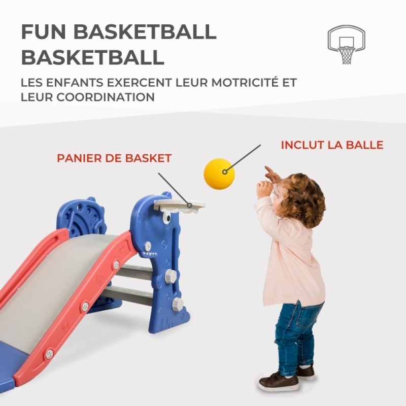 COMPREND UN PANIER ET UNE BALLE : Le toboggan Dino comprend un panier et une balle pour augmenter les options de jeu des plus petits en faveur de la motricité et de la coordination.
