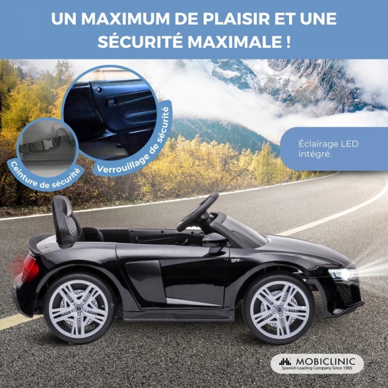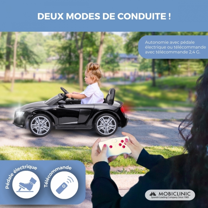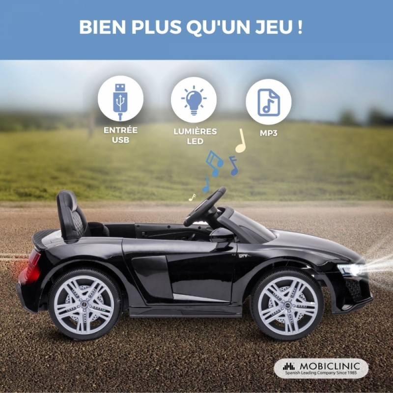 La voiture électrique MobiSporty, sous licence Audi R8 Spyder, offre une expérience de conduite réaliste et sûre aux enfants de 36 à 72 mois. Idéal pour l'intérieur et l'extérieur, ce véhicule est équipé d'une pédale électrique, d'une télécommande 2,4G, de lumières LED et de fonctions Bluetooth.