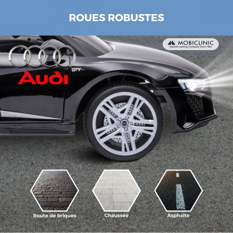 La voiture électrique MobiSporty, sous licence Audi R8 Spyder, est conçue pour offrir une expérience de conduite authentique et sûre aux plus petits. Avec des dimensions de 107 cm de long, 58 cm de large et 48 cm de haut, cette voiture électrique est parfaite pour les enfants entre 36 et 72 mois, offrant une manière ludique et éducative de développer la motricité et la coordination.