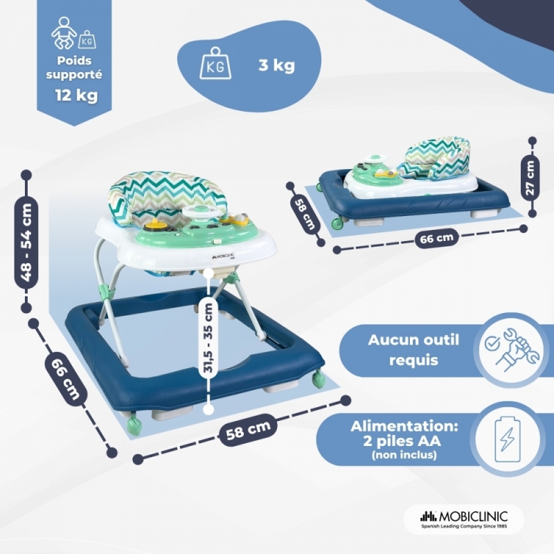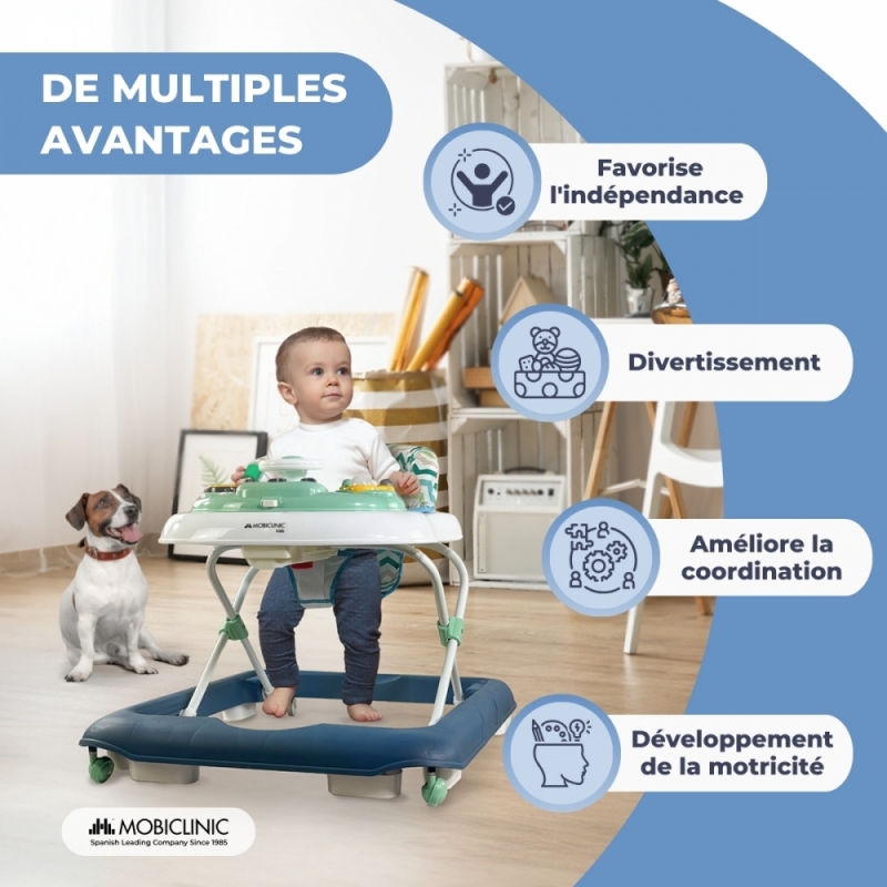 FONCTIONNALITÉ : Ce trotteur pour bébé est conçu pour que les petits puissent faire leurs prim pas en toute sécurité et de manière amusante. Grâce à sa structure qui assure stabilité et soutien, bébé renforcera ses jambes et améliorera sa coordination lors des mouvements. Sa base garantit un mouvement équilibré, évitant le renversement et assurant la sécurité.