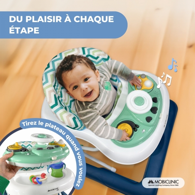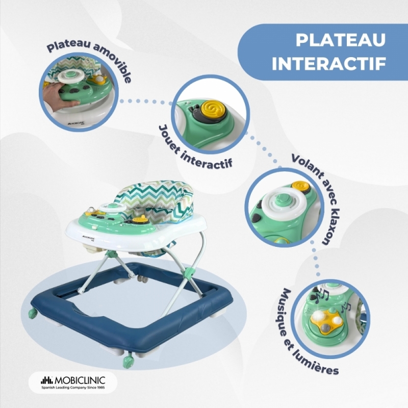 Il dispose d'un plateau interactif, équipé de trois jouets, de lumières et de musique, gardant toujours bébé diverti tout en interagissant et en explorant. Le plateau est amovible, ce qui permet au bébé de jouer avec lui séparément, offrant ainsi une autre option de divertissement.