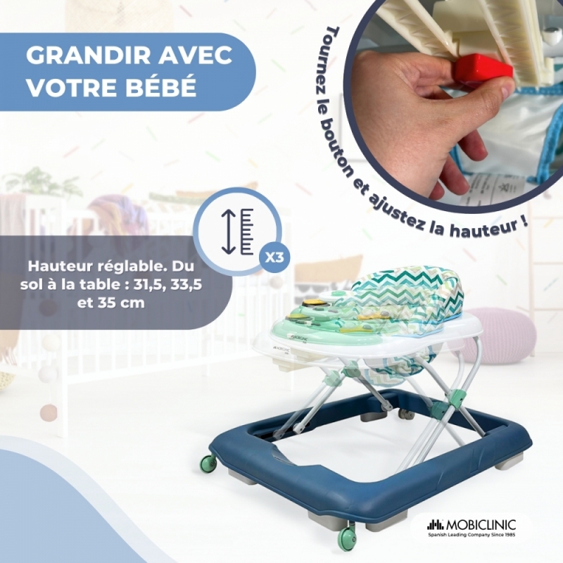 RÉGLABLE EN HAUTEUR : Conçu pour grandir avec votre bébé. Ce déambulateur dispose de 3 positions de hauteur réglables, qui lui permettent de s'adapter au développement de votre enfant et de garantir une posture adéquate et confortable à tout moment, favorisant la sécurité et l'ergonomie.