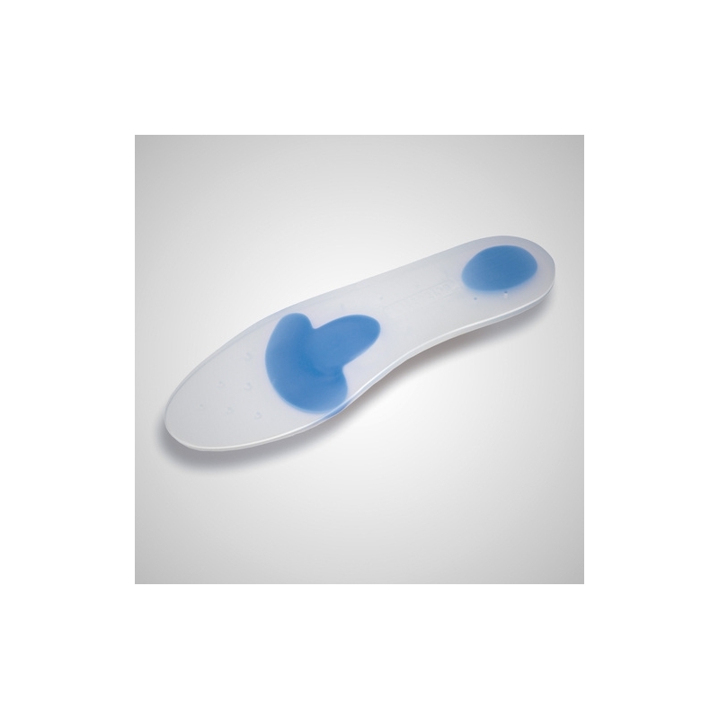 Semelle intérieure en silicone viscoélastique avec voûte longitudinale interne, support rétrocapital central et avec des coussinets en silicone de moindre densité sur les têtes métatarsiennes et le talon qui permettent une répartition homogène de la pression sur la plante du pied. Ils remplissent une fonction d'amortissement de l'impact du pied contre le sol, procurant une sensation de confort et de détente. Indiqué pour le traitement des algies plantaires, les personnes qui restent debout longtemps, dans des marches prolongées ou qui effectuent des exercices répétitifs.