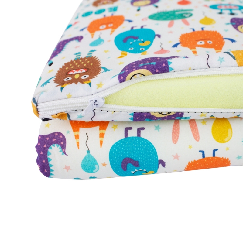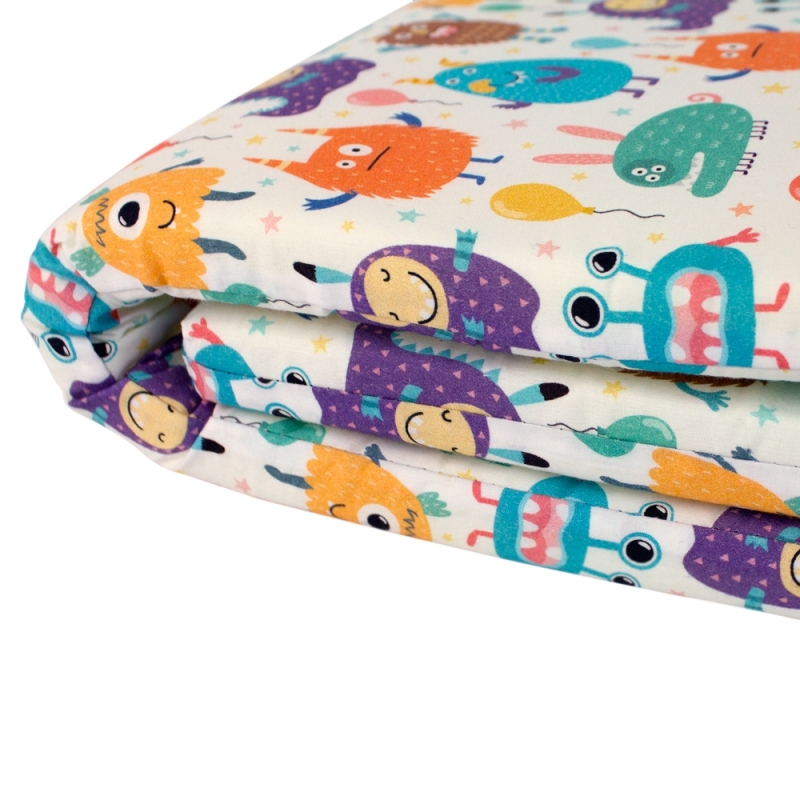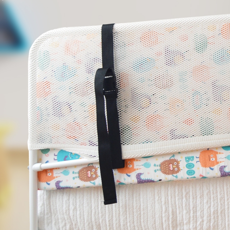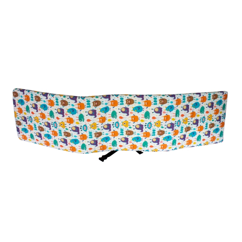 Protecteur rembourré pour les barrières de lit des enfants. Sa fonction est d'empêcher l'utilisateur de heurter les barrières en bois ou en métal du lit et d'éviter en même temps qu'il ne se coince accidentellement entre les barreaux du lit. Il est fabriqué en mousse de polyuréthane à l'intérieur et recouvert d'une housse en coton doux avec des imprimés pour enfants. Il comporte 3 boucles de réglage, qui servent à fixer et à ajuster le protecteur aux barreaux, selon les besoins.