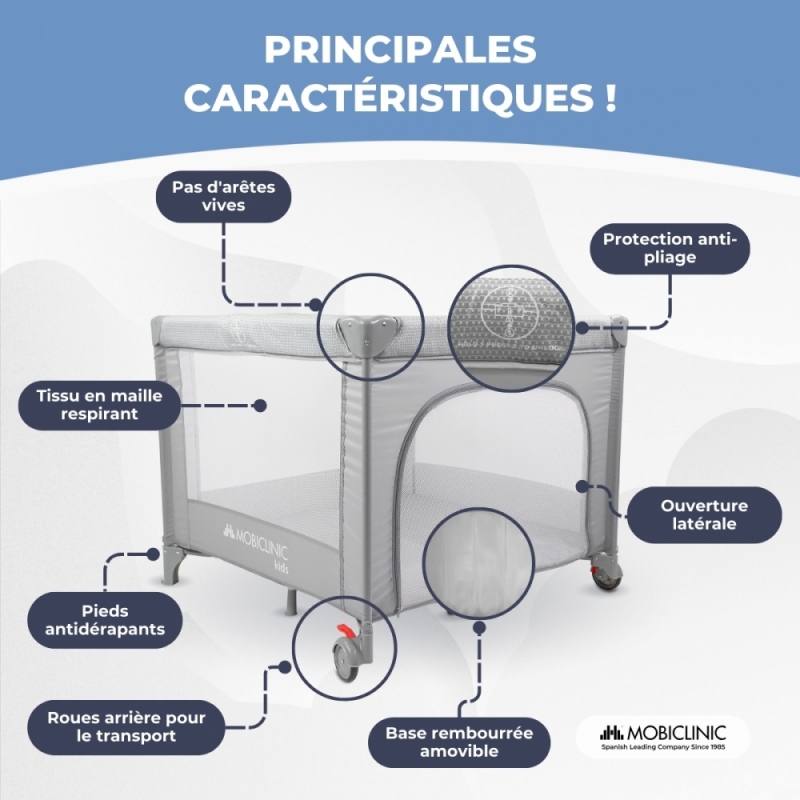 CARACTÉRISTIQUES PRINCIPALES : Ce parc pour enfants est équipé d'un matelas confortable qui offre un soutien idéal pour le repos et le jeu. Ses roues arrière avec freins permettent un déplacement facile et sûr, tandis que ses coins résistants et ses pieds antidérapants garantissent stabilité et durabilité. Il dispose également d'une maille respirante qui facilite la ventilation et assure la visibilité et d'une ouverture latérale pratique avec une fermeture éclair.