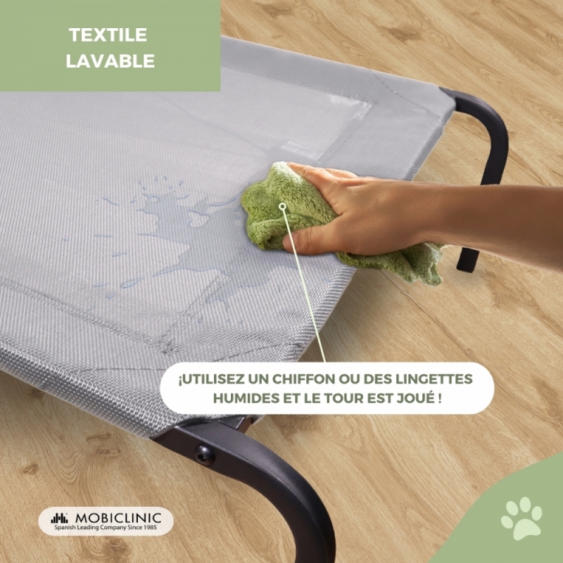 Le lit Cleo offre une grande facilité de nettoyage, car il permet de laver la maille avec des lingettes ou directement en appliquant de l'eau. Pour un nettoyage plus approfondi, utilisez simplement un savon doux ou un nettoyant naturel sur toutes les surfaces et rincez abondamment. Vous aurez l'aire de repos de votre animal complètement propre !