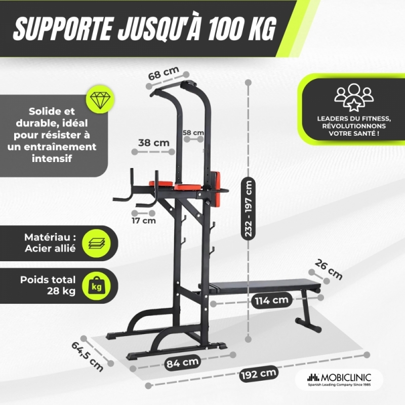 Les poignées ergonomiques antidérapantes permettent une prise en main confortable, évitant les mauvaises postures qui pourraient endommager les poignets. De plus, le dossier offre un soutien supplémentaire pour les exercices tels que les levées de jambes, garantissant une pratique plus sûre et plus efficace. Avec ses dimensions pliables, cette station est facile à ranger et à transporter , ce qui en fait une option idéale pour ceux qui souhaitent une salle de sport à domicile sans prendre trop de place.