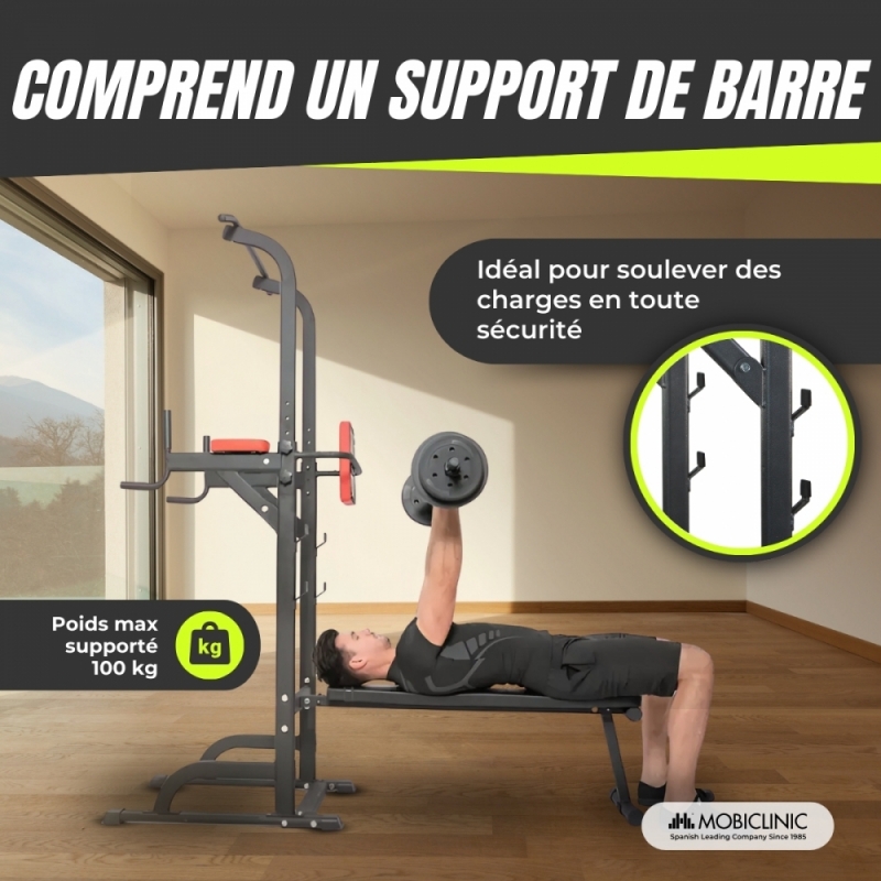 Multifonctionnalité dans un seul équipement : Cet équipement de fitness 9 en 1 vous permet d'effectuer une grande variété d'exercices : levées de jambes, développé couché, tractions, squats, etc. Idéal pour améliorer la force du haut du corps et favoriser un développement physique complet.