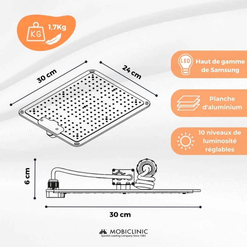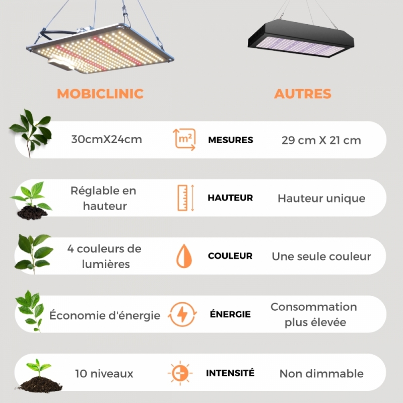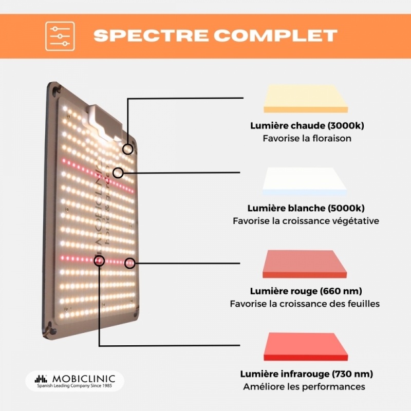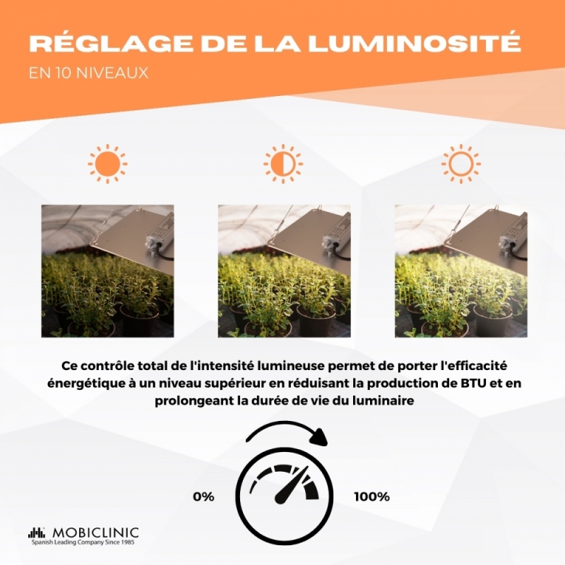 En termes d'efficacité énergétique, la lampe pour plantes Growlight offre 10 niveaux de luminosité réglables (10 %, 20 %, 30 %, 40 %, 50 %, 60 %, 70 %, 80 %, 90 % et 100 %). Cela vous permet de sélectionner le niveau le plus approprié pour vos plantes, en ajustant l'intensité de la lumière à spectre complet , qui comprend 660 nm de lumière rouge, 730 nm de lumière infrarouge et 460 nm de lumière bleue. Ce contrôle total de l'intensité lumineuse amène l'efficacité énergétique à un niveau supérieur, réduisant la production de BTU et prolongeant la durée de vie du luminaire.