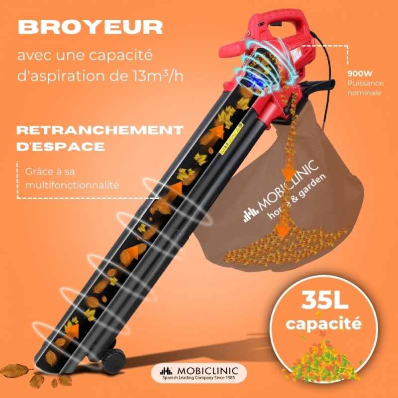 MOTEUR HAUTE PERFORMANCE : Équipé d'un puissant moteur électrique de 900 W avec une vitesse à vide comprise entre 9 000 et 15 000/min, le souffleur de feuilles Mobiclean offre une puissance constante et efficace . Les feuilles, le papier et les petites branches ne posent aucun problème à ce moteur puissant.