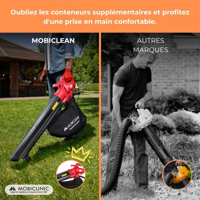 Avec 6 niveaux de vitesse, cet outil 3-en-1 s'adapte à tous les scénarios, des tâches légères aux défis plus intenses. Ses fonctions vont au-delà du simple soufflage , il aspire et broie également, tout en un. Le changement entre les fonctions très simple. Avec le souffleur de feuilles Mobiclean, transformez les tâches quotidiennes comme garder votre jardin, maison, terrasse ou porche propre en une expérience sans tracas.