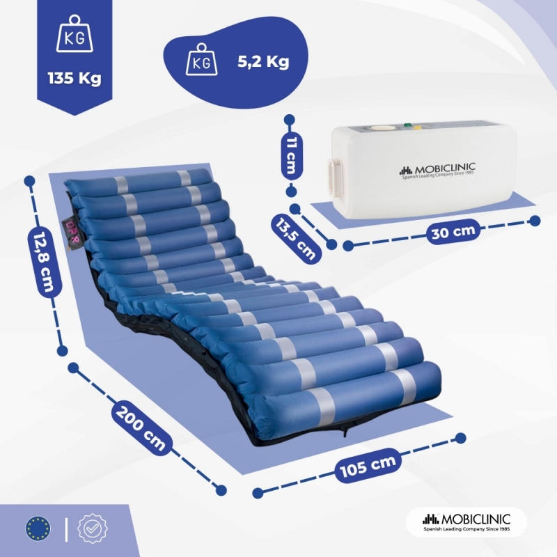 Il s'adapte à tous les lits et peut donc être utilisé à domicile comme à l'hôpital, pour un sommeil réparateur, confortable et sûr. Très facile à installer, il se fixe sur un matelas anti-escarres, laissant les tubes au pied du lit pour les connecter au compresseur silencieux inclus.