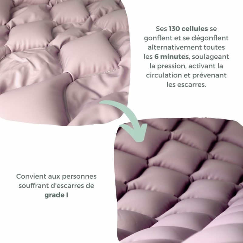 Ses 130 cellules individuelles se gonflent et se dégonflent alternativement pendant des périodes de 6 minutes et de cette façon, le patient recevra un soulagement constant de la pression . Cette pression, répartie sur la structure par alternance de cellules, active la circulation et prévient la formation d'escarres.