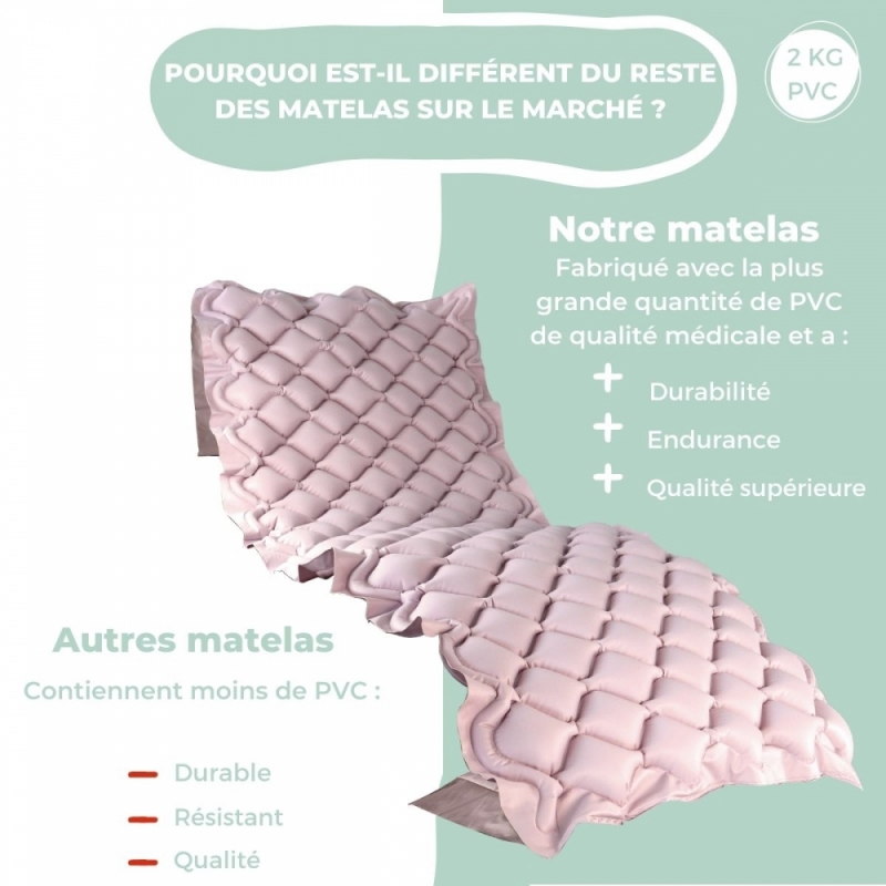 Ce matelas gonflable anti-escarres possède des alvéoles alternées et un réglage en fonction du poids du patient, répartissant la pression exercée par le corps sur la structure.