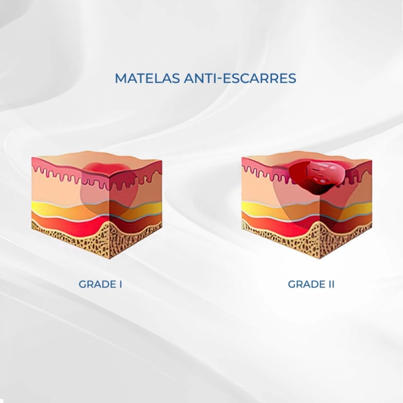 TRÈS UTILE : Ce matelas anti-escarres est indiqué pour les patients alités présentant des escarres de grade 1 et 2. Les cellules se gonflent et se dégonflent en s'adaptant au poids de l'utilisateur (jusqu'à 135 kg).