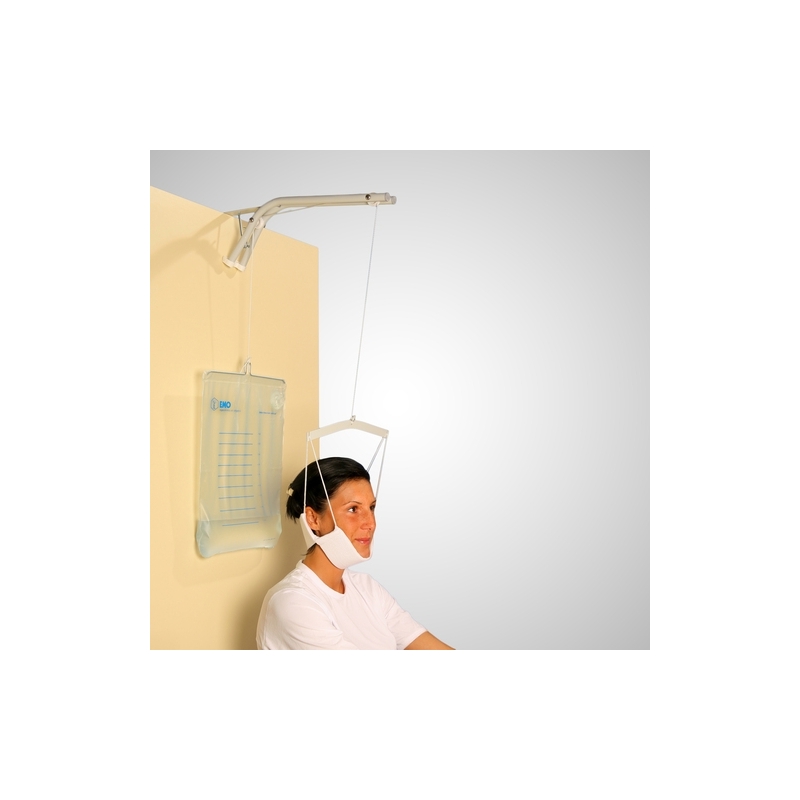 Système simple à assembler et à utiliser pour obtenir une traction cervicale efficace du patient dans une porte ou sur le mur. Un système de poulie nous permet de régler l'angle de traction tandis que le remplissage du sac nous permet de régler le poids ou la force de traction.
