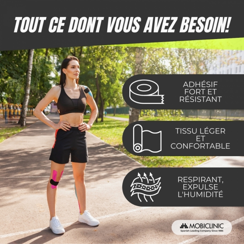 Blessures comme foulures de cheville, œdèmes, épicondylite ou tension plantaire peuvent se soulager rapidement avec ses bandages kinésiologiques qui améliorent le muscle débilité.