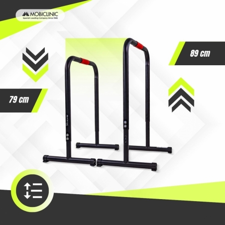 HAUTEUR RÉGLABLE : Ces barres parallèles offrent deux niveaux de hauteur (79 et 89 cm) qui s'adaptent aux besoins de l'utilisateur. Cela vous permet de varier l'intensité de vos entraînements en fonction de votre force et de votre taille. Idéales pour les débutants et les utilisateurs plus expérimentés souhaitant progresser en callisthénie ou en CrossFit à domicile.