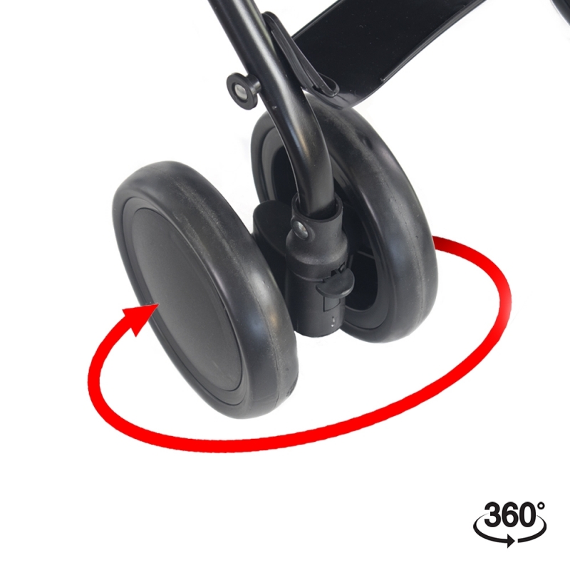 ROUES AMOVIBLES : les roues de la poussette pliante Elefant sont facilement démontables, il suffit d'appuyer sur un bouton pour les retirer, ce qui facilitera le rangement de la chaise. De plus, les roues avant de cette poussette ont une rotation à 360º pour permettre des mouvements légers et avec un système anti-rotation pour les fixer quand c'est plus confortable. De plus, ses roues arrière disposent d'un frein de blocage et d'une pédale de frein indépendante sur chaque roue, pour pouvoir les bloquer à tout moment et éviter d'éventuels accidents.