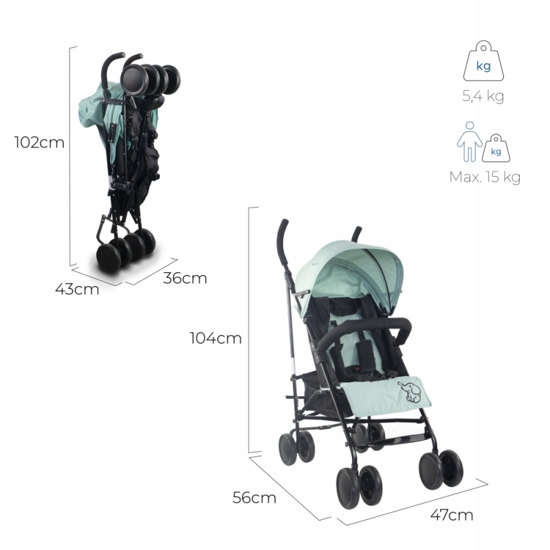ADAPTÉ POUR : La poussette inclinable Elefant est une poussette compacte qui peut être utilisée jusqu'à ce que l'enfant atteigne un poids maximum de 15 kg conformément à la réglementation.