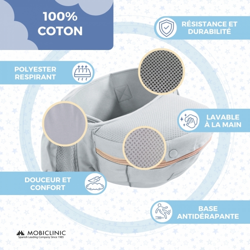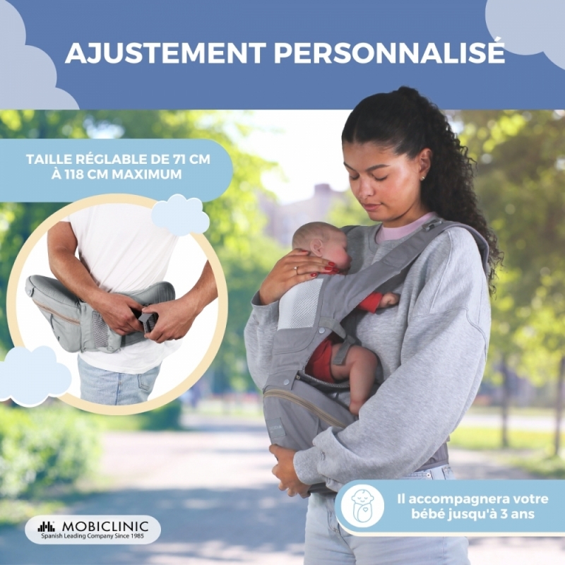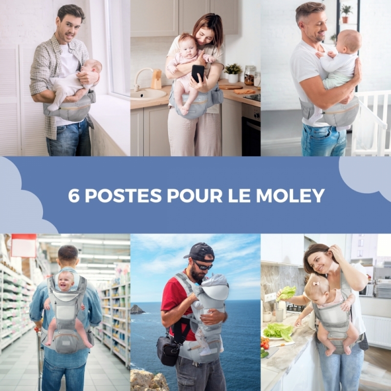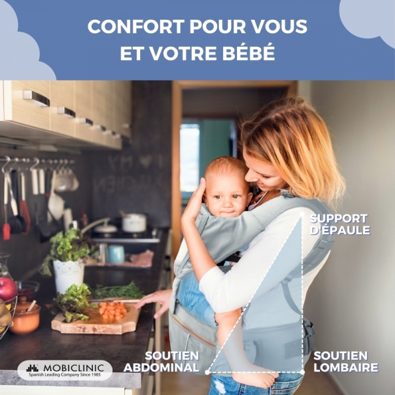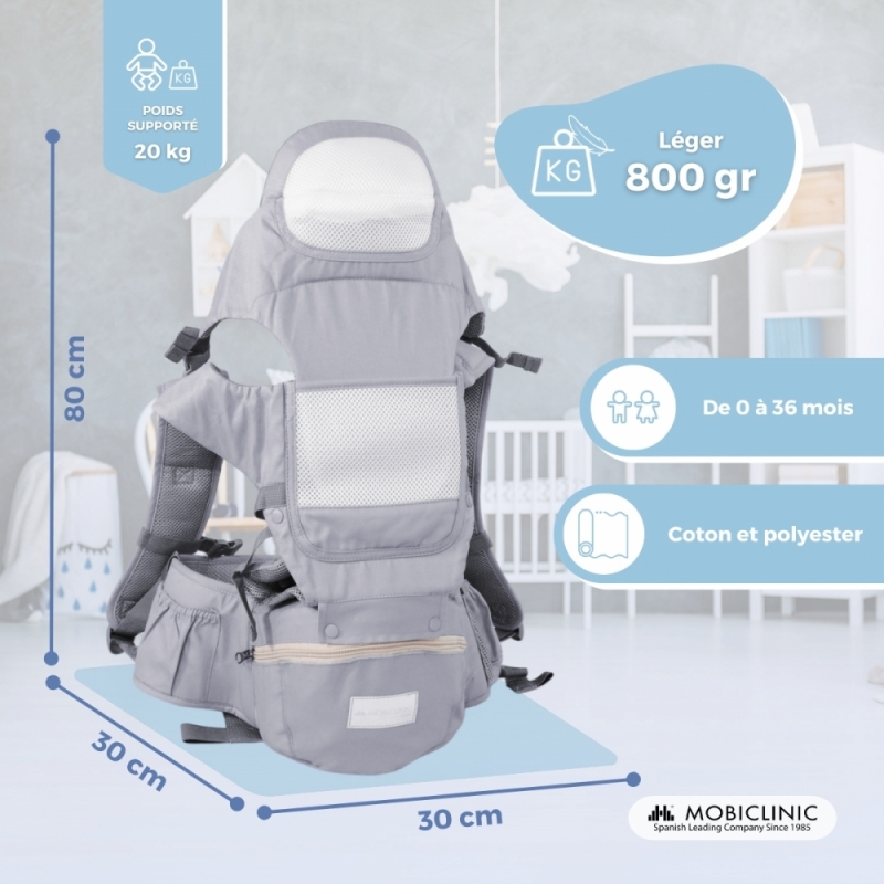 Porte-bébé 6 en 1 | Respirant | 0-36 mois | Bretelles réglables | Coton | Poche | Gris | Moley | Mobiclinic