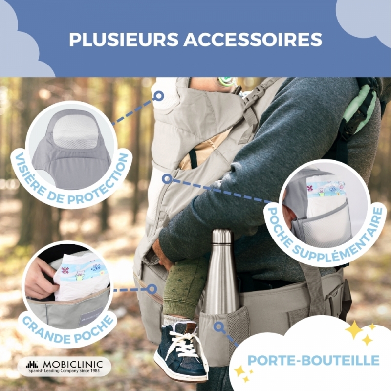 ORGANISATION ET ACCESSIBILITÉ : Le porte-bébé comprend une poche zippée pratique pour ranger facilement les affaires de bébé , permettant un accès rapide et confortable aux objets essentiels (couches, tétines, clés, mouchoirs, documentation, téléphone portable, collations, petits vêtements de rechange... .). De plus, il dispose d'un repose-bouteille sur le côté pour plus de commodité.