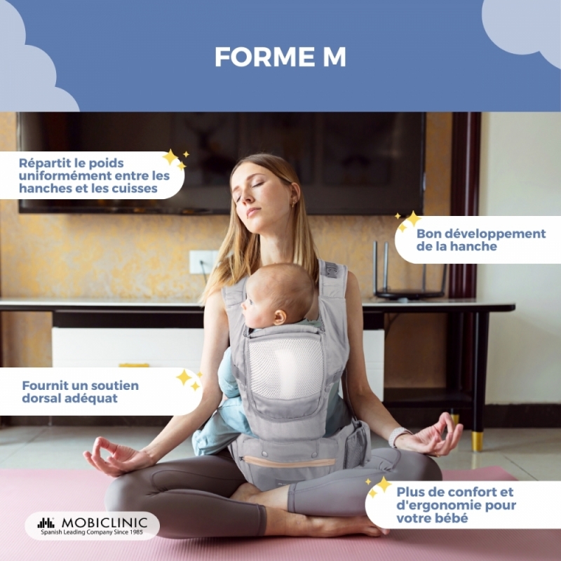 Côté ergonomie, le porte-bébé offre une position en M lorsque bébé est assis, optimisant son développement et son confort en assurant un maintien adéquat de son dos et de ses hanches. Le porte-bébé favorise la posture ergonomique du bébé en lui permettant d'adopter la position naturelle accroupie .