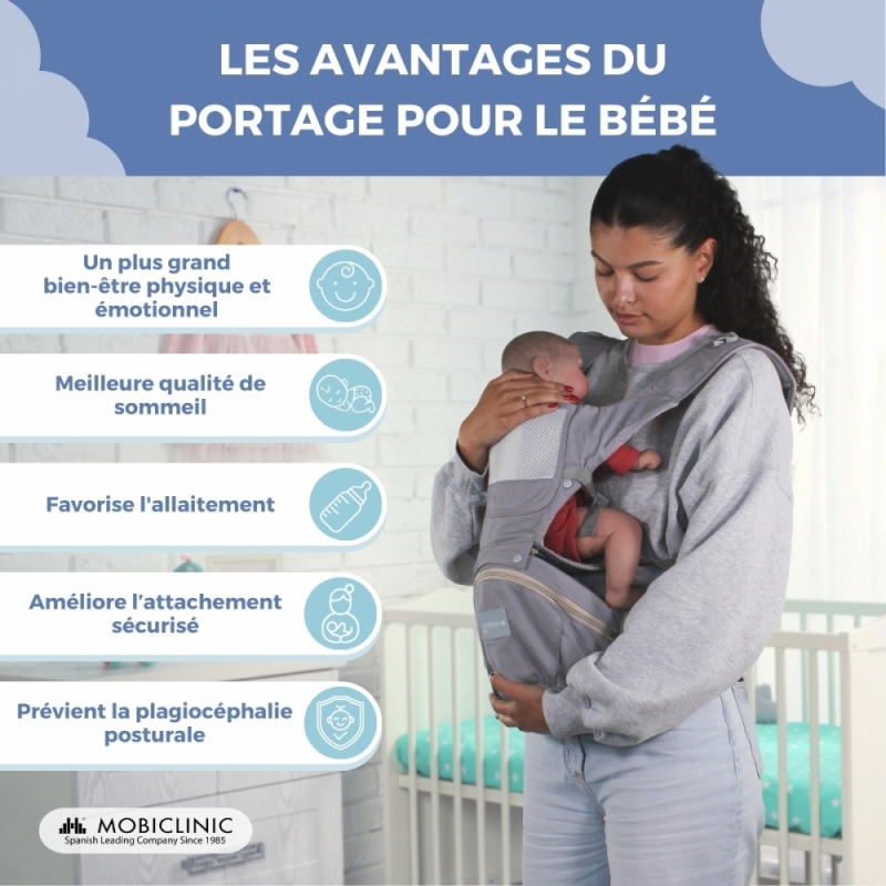En plus de favoriser la liberté de mouvement, le porte-bébé contribue à la réduction des coliques et au renforcement des muscles du bébé , grâce à la position verticale qui favorise le système digestif et l' expulsion des gaz . Cela se traduit par des bébés plus calmes et plus stables émotionnellement, qui, en se sentant en sécurité et à l'aise, connaissent une diminution du stress et pleurent donc moins.
