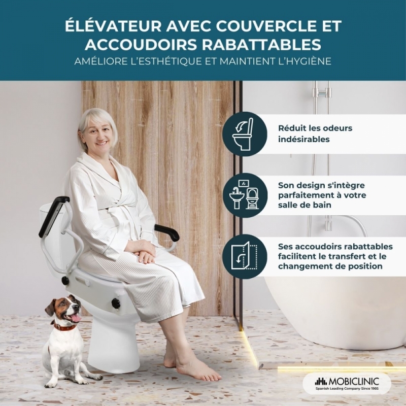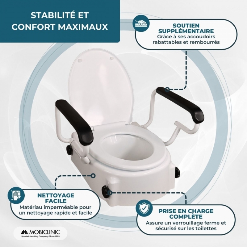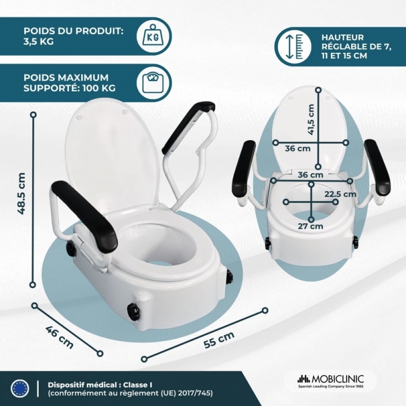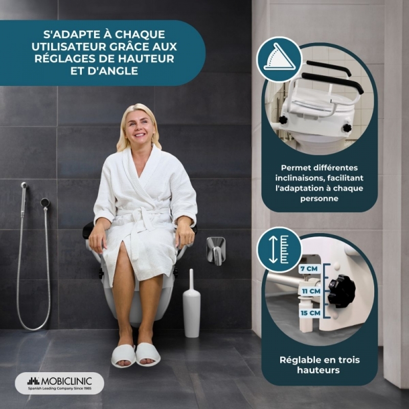 Cet élévateur pour toilettes est parfait pour les personnes ayant des besoins particuliers qui ont besoin d'une aide à la toilette : inclinable, réglable, avec accoudoirs et couvercle rabattables, qui facilite l'hygiène quotidienne et améliore leur autonomie et leur estime de soi.
