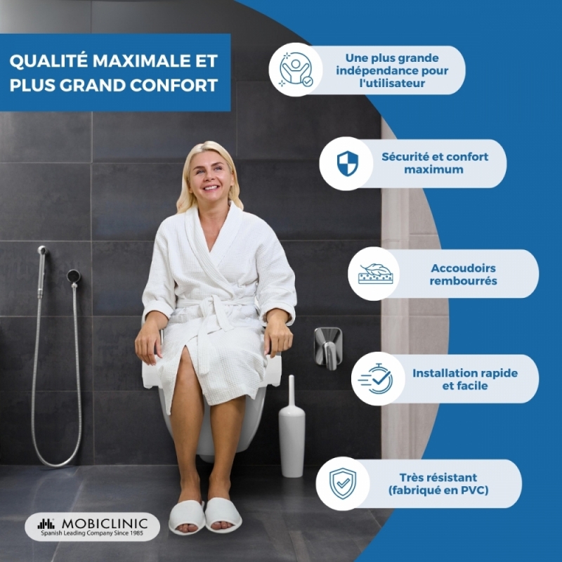 Ce rehausseur de toilette pour adultes est très apprécié grâce à son design original et à sa qualité de fabrication. Ce modèle de siège de toilette est équipé d'accoudoirs rembourrés pour plus de confort et de sécurité. Il est fabriqué en polypropylène injecté, ce qui en fait un rehausseur de WC très résistant, adapté à une utilisation quotidienne et constante.