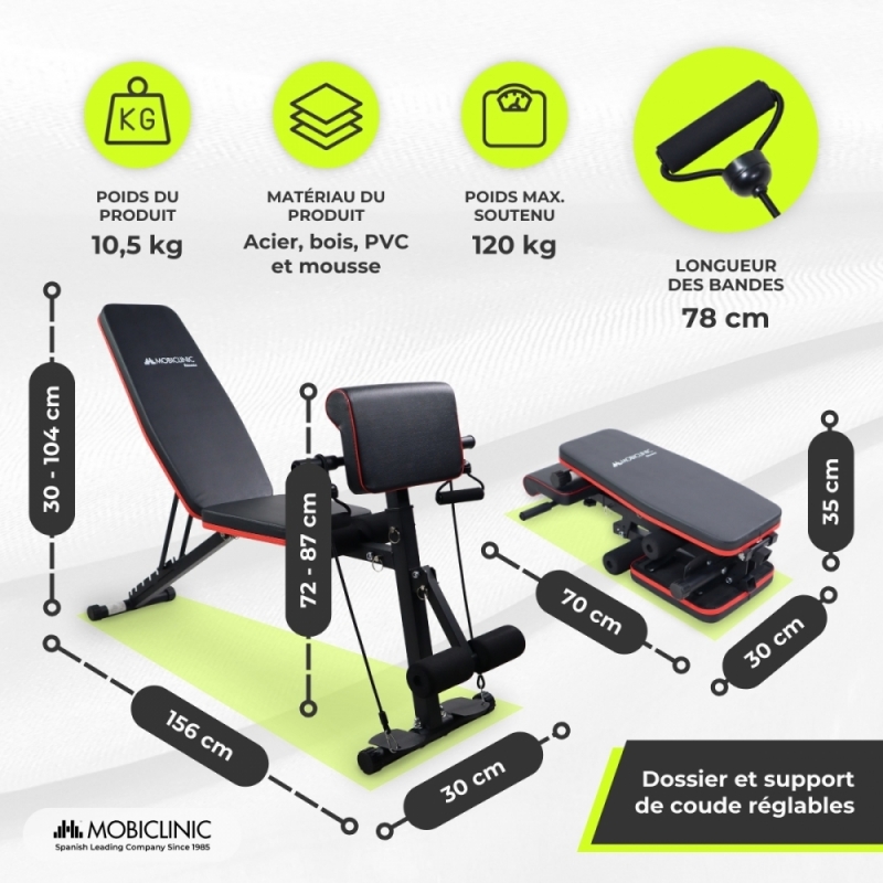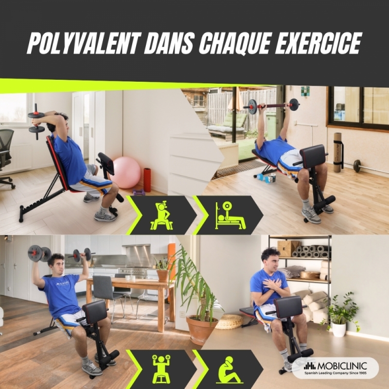ENTRAÎNEMENT COMPLET : Ce banc de musculation réglable vous permet d'effectuer une grande variété d'exercices, des développé couchés aux redressements assis, en passant par les pompes et les exercices des bras et de la poitrine. Il est idéal pour un entraînement fonctionnel et spécifique, adapté aux débutants et aux utilisateurs plus avancés. De plus, il comprend des bandes de résistance pour élargir les options d'entraînement et faire travailler davantage de groupes musculaires.