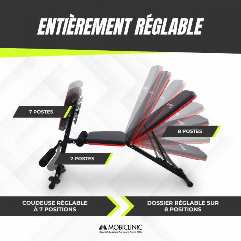 RÉGLABLE POUR CHAQUE EXERCICE : Il dispose de 8 positions réglables pour le dossier et de 7 positions pour l'avant, offrant une polyvalence totale pour personnaliser votre entraînement. De plus, il dispose également de coussinets de pieds également réglables, assurant confort et stabilité à l'utilisateur.