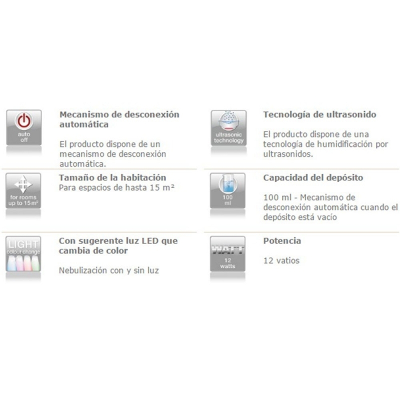 C'est un parfum qui incorpore la technologie des ultrasons: les vibrations à haute fréquence, qui génèrent de petites gouttes de surface de l'eau et grâce à la lumière LED (qui change de couleur), vous pouvez profiter de 4 couleurs relaxantes combinées à l'arôme des huiles aromatique soluble dans l'eau fera que votre corps passe des moments agréables d'utilisation.