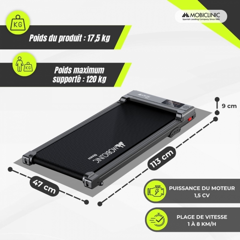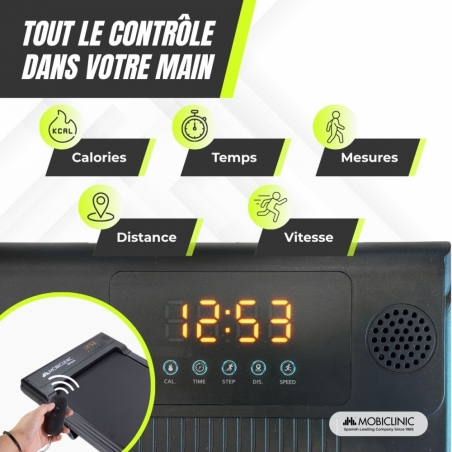 Il offre une vitesse réglable jusqu'à 8 km/h , s'adaptant aux allures de marche modérées et rapides, idéal pour tous les utilisateurs. Sa télécommande permet de régler la vitesse ou de mettre l'appareil en pause d'un simple clic, pour plus de confort et de sécurité.